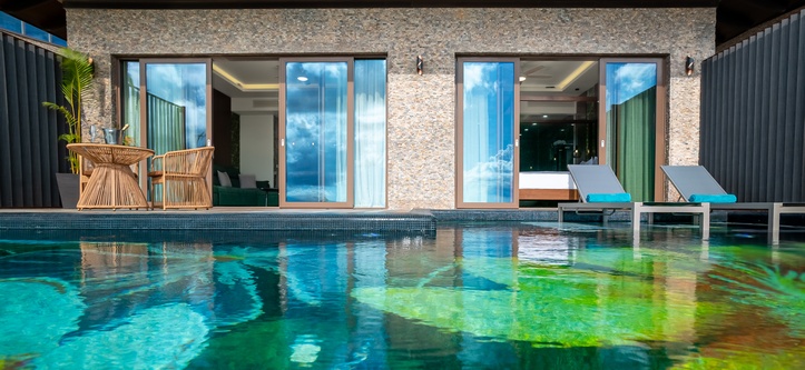 The private 9-meter pool, adorned with exquisite mosaic tiles featuring a floral motif, is the heart of each villa, creating an atmosphere of peace and intimacy.